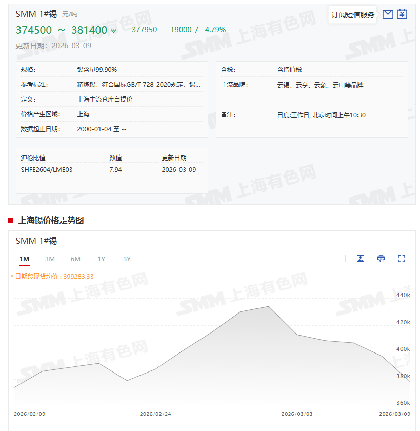 锡价2月涨8.34%3月以来已跌逾%