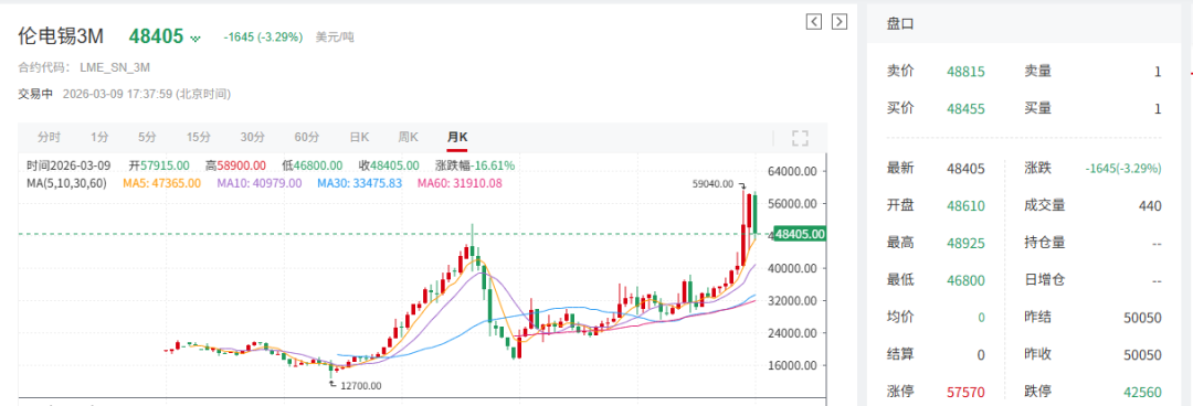 锡价2月月线收阳,其中:伦锡2月月线涨11.73%,沪锡2月月线涨2.73%。进入3月以来,受中东地区冲突升级的影响,市场风险偏好有所回落,有色金属整体承压;同时国际油价上行推升通胀担忧,市场对美联储降息时点预期延后,叠加锡市供应改善预期、库存持续累积等因素,锡价出现明显回落,截至9日17:37分,伦锡跌3.29%,报48405美元/吨,其3月月线暂时跌9.84%;沪锡跌2.4%,报383710元/吨,其3月月线暂时跌11.02%。